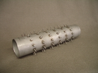 パイプの円周上30°おきに、ピッチが2.5でスタッドを加工しています。機械加工ではなく、手加工のため、冶具作成を工夫しました。